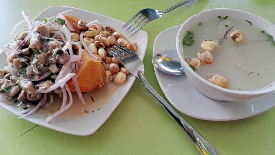 Ceviche(柠檬腌生鱼)是来秘鲁必吃的食物,活生生的鱼切片后腌入柠檬汁和其他调味料,腌好后和其他食材如蒸熟的番薯、玉蜀黍和洋葱,做成拼盘,吃起来口感和味道一流。有些还配有一碗鱼骨熬煮成的汤,鲜甜美味,是一道人间美食。