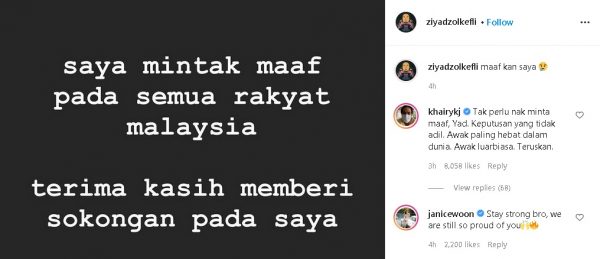 吉雅今早透过个人IG限时动态写道:我要向全马来西亚人民道歉,感谢你们给我的支持。