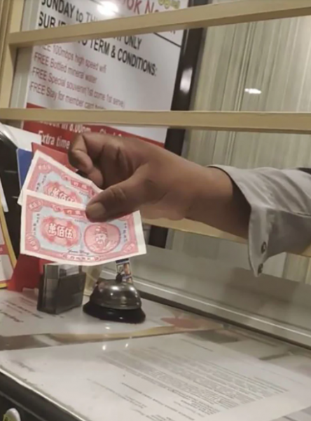 视频可见该外籍男子郑重地拿出两张纸钞,表明自己想入住旅馆,而接待员认真一看,才发现是面值500万的冥纸!