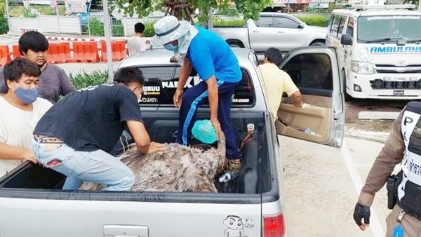 (泰国4日讯)泰国春武里府直辖县罗宾逊商场对面路段于1日异常拥堵,很多人以为前面发生了交通意外事故,没想到竟是一只不知从何处来的高大鸵鸟,肆无忌惮地在马路上趴趴走,闻讯的警察和市民随后展开一场混乱的追捕大赛,耗费了2个多小时才逮住鸵鸟。