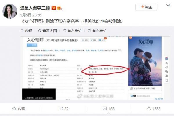 目前张钧甯手上还有3部电影、一部电视剧待播。其中待播电视剧作品是今年才刚杀青,改编自毕淑敏的长篇小说,由柯汶利执导,杨紫、井柏然合演的《女心理师》。微博的影剧博主又爆出张钧宁被参演新剧《女心理师》给除名,并PO出百度百科的截图,张钧宁已被消失在演员名单中,且传出戏份也遭到删除。