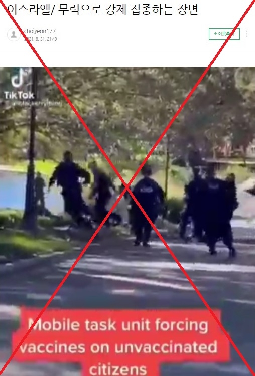 韩国社交媒体近来有多名用户分享一段警察在公园追人的视频,声称以色列强制民众接种疫苗,并把他们击倒在地。