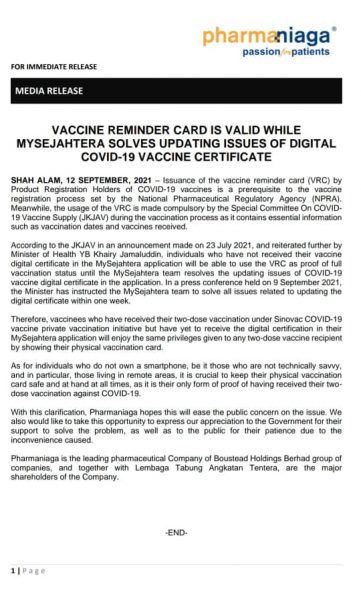 (八打灵再也12日讯)发马(Pharmaniaga)公司表示,在My Sejahtera手机应用程式解决更新问题的期间,纸本疫苗卡依然有效。