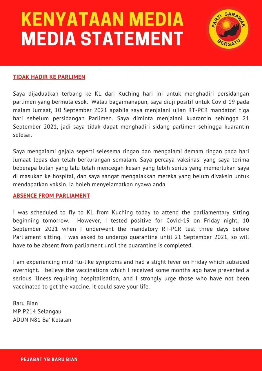 另外,巴鲁比安今早发文告表示,本身原本今日从古晋飞往吉隆坡,出席明日起召开的国会。不过,他在前天(10日)晚上进行冠病检测,报告显示阳性反应。