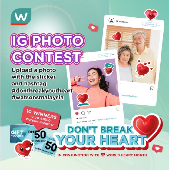 为了配合国际心脏日,Watsons 举行IG有奖竞赛,只需要简单三个步骤即有机会赢取RM100 Watsons 折扣券。