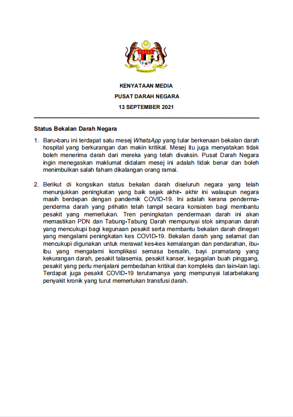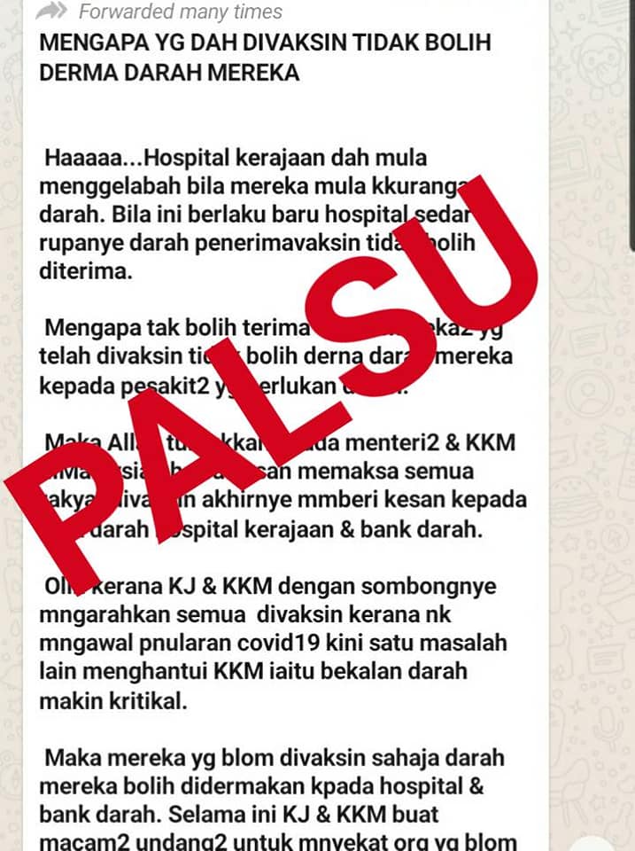 (八打灵再也14日讯)近期WhatsApp流传有关医院的血液供应已日益短缺,可是医院不接受已接种疫苗者的血液,惟国家血库中心已否认这样的说法,并认为这将引起公众的误解。