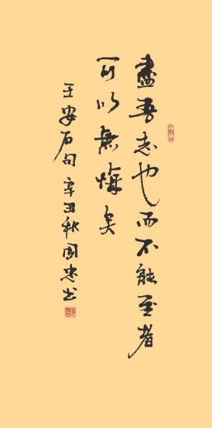 这是王安石在〈游褒禅山记〉中的句子。褒禅山有二洞,前夷后险,一般游客就易避难,只游前洞。王安石与3位友人决定一探后洞,他们拥火前进,“入之愈深,其进愈难,而其见愈奇”,本该继续寻幽访胜,害怕火把熄灭,遂停。一出洞中就后悔了,矛头指向最先主张退出的朋友。比起游险之群,他们所入不足十分一。王安石叹说要完成心愿,意志、体力、物质条件都不可缺。他体力不错,火把尚亮,只因盲从朋友,以后让人讥笑也是自作自受。他说即使不能达标,也该尽力,悔恨才不会出现。