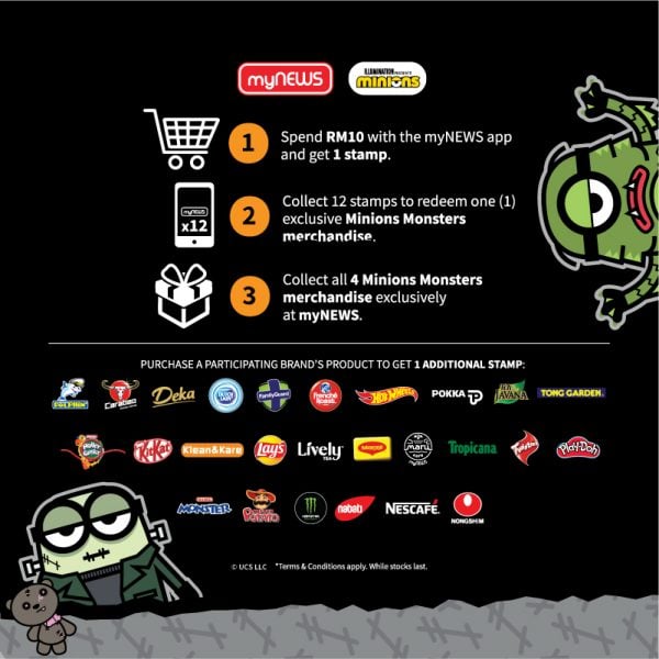 活动期间,消费者只需使用myNEWS应用程序结账,并在单张收据中花费RM10即可获得一枚印章,集齐12枚印章就可兑换一个专属的小黄人怪兽角色。消费者可在9月1日至30日期间领取折叠伞的印章,并于9月15日至11月30日进行兑换;而枕头毯的印章可于10月1日至31日期间领取,并于10月7日至11月30日进行兑换。