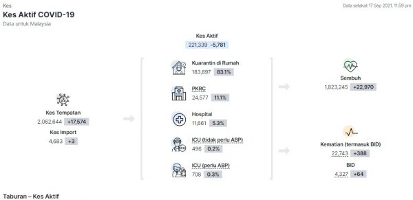 卫生部COVIDNOW网站显示,目前有83.1%确诊患者或18万3897人正在居家隔离,11.1%或2万4577人在低风险冠病治疗及隔离中心(PKRC),5.3%或1万1661人在医院。