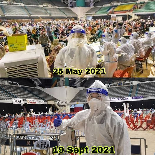 他在帖文中写道:“在两个不同日期的同一高峰时间所拍下的冠病评估中心(CAC)现场。许多人已经完成接种疫苗,而病例也似乎正在减少,希望一切都会有所改善,而我们以后也将恢复到像往常一样生活。”