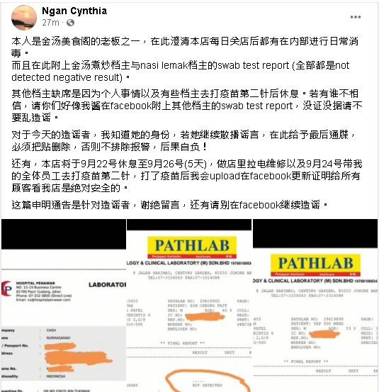 一位自称是金汤美食阁老板之一的“Ngan Cynthia”在脸书发文促请造谣者必须把造谣的帖文删除,否则将向警方报案。