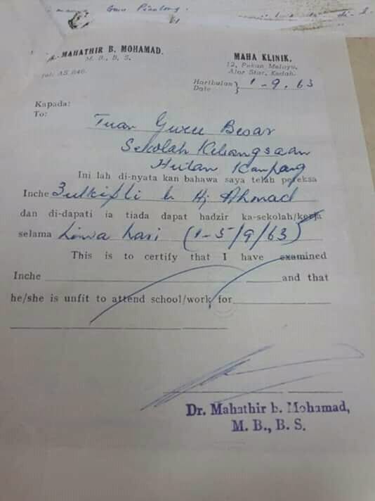 虽然这当时只是一张学生的病假单,但回头看马哈迪在大马政坛叱诧风云,两度任相的历史,俨然已成了一个具保存价值的历史文物。