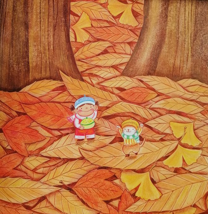 是秋末初冬吧,莎娜和鲁鲁围上了围巾,旁边的枝桠上套着五颜六色的帽子,到底这是什么样的有趣故事呢?我们已经迫不及待。