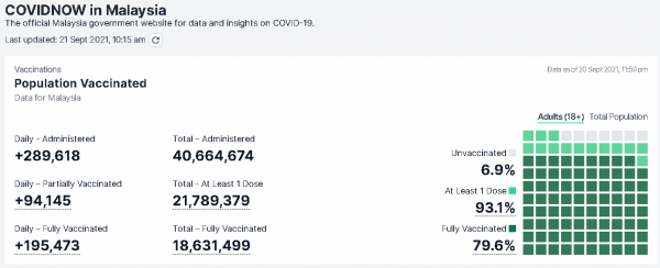 根据卫生部COVIDNOW网站发布的数据显示,成人人口中,有93.1%的人至少接种了一剂疫苗,而79.6%的成人完成疫苗接种。