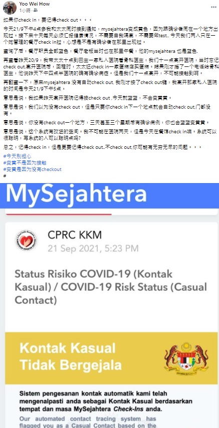 “再翻查一下,原来mysejahtera没有自动Check-out。我刚才按了check-out键,我离开那家私人医院的时间是今天(21/9)下午5时。”