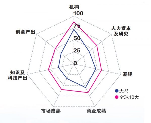 在这7个支柱中,大马在市场成熟度的排名为30,在知识和科技产出排名31、在创意产出排名37、商业成熟度排名39、人力资源和研究排名39、体制排名41和基建排名51.在大马的优势方面,大马高科技出口在贸易总额中的占比(%)这一细分指标,则排名第一。