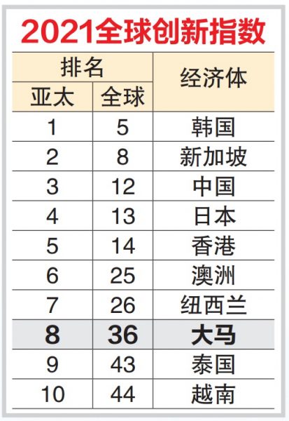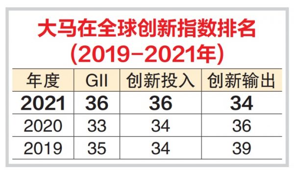 该报告指出,大马在创新输出的表现优于创新投入。2021年创新输出的排名为34,高过2020和2019年的36和39。