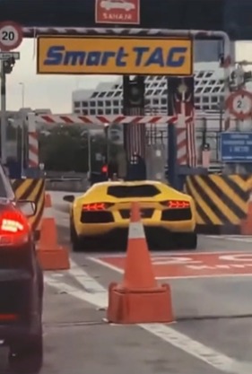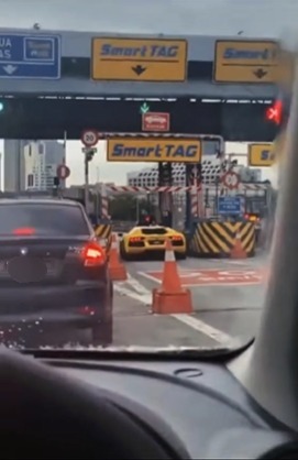 影片可见Kenny正在一触即通(Touch N‘ Go)的车龙里等候,蓝宝坚尼则正驶入隔壁无车龙的精明通关感应器(Smart Tag)车道。在栏杆尚未升起之际,蓝宝坚尼就直接驶离收费站,也因其低身设计而没被划出痕迹。
