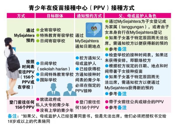“至于患有行动障碍如过度活跃症(ADHD)、自闭症和精神障碍的在籍学生,可以前往医院或卫生部诊疗所接种疫苗。教育部将会把这一类的青少年列入名单中,以便在这些医疗设备安排预约。”