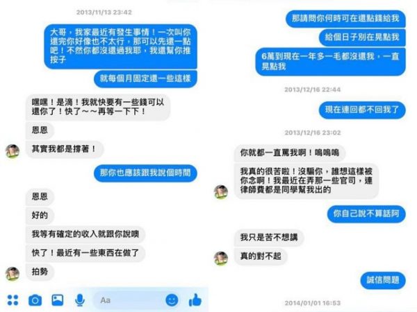 李妍瑾在脸书提到之前有位导演欠她钱6万台币,“从我阿嬷过世之前到我爷爷也过世我爸也过世,一直有询问他如何还款,总之细节不想多聊,今天收到石先生的电话,一直鬼打墙说我弄他,我问他请问你还钱了吗?他的语气也跟我要了帐号,我不想被波及到我的名声以及权利,在此先发文!”