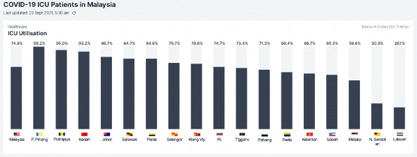 目前仅有森美兰和纳闽的ICU使用率少于50%,分别是30.9%和26.1%。