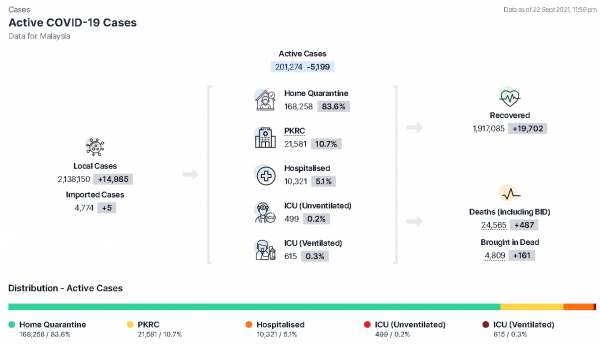 这些活跃病例中,有83.6%确诊患者或16万8258人正在居家隔离,10.7%或2万1581人在低风险冠病治疗及隔离中心(PKRC),5.1%或1万零321人在医院。