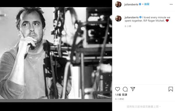 罗杰米契尔日前传出离世消息,家人证实死讯并说他在22日离世,具体原因和状况并无透露。茱莉亚罗拔丝得知消息后非常难过,以罗杰米契尔黑白照片哀悼:“我深爱着我们共度的每一时刻,RIP,罗杰米契尔。”文末更贴上一个心碎的表情符号以示心境。