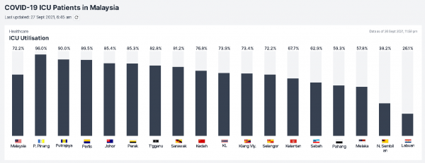 其他州属和直辖区的ICU使用率皆在90%或以下,包括雪兰莪(89%)、霹雳(83%)、玻璃市(82%)和柔佛(80%)。