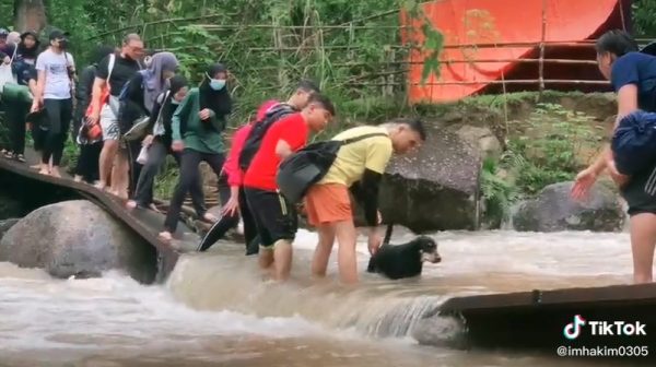 影片可见一只流浪狗也想和众人一起渡河,唯水流湍急致使它裹足不前,数名青年见状立即在桥梁一侧筑起人墙,以确保浪浪不会被冲到下游。