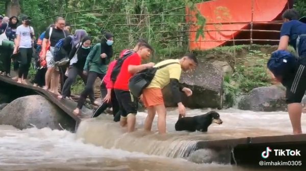 (乌雪27日讯)流浪狗在断桥前裹足不前,数名青年见状立即筑成人墙,帮助浪浪成功渡河!