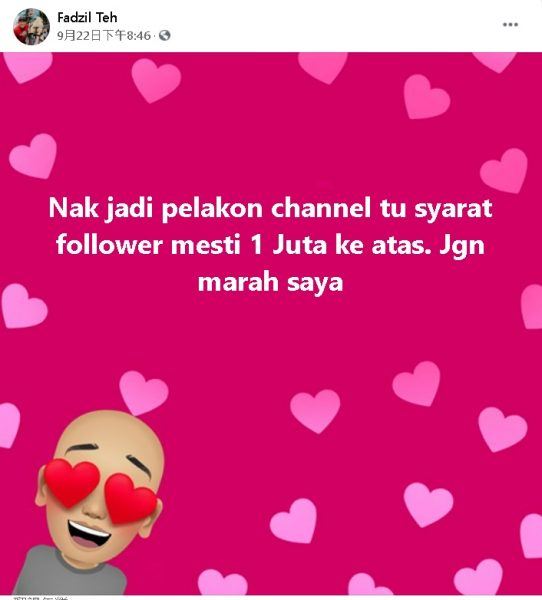 (吉隆坡28日讯)“要演戏,先有百万粉丝吧!”大马制片人法兹郑(Fadzil Teh)上周在脸书撰文:“若要在成为这频道演员,条件是有百万的追随粉丝”后,引起热议。