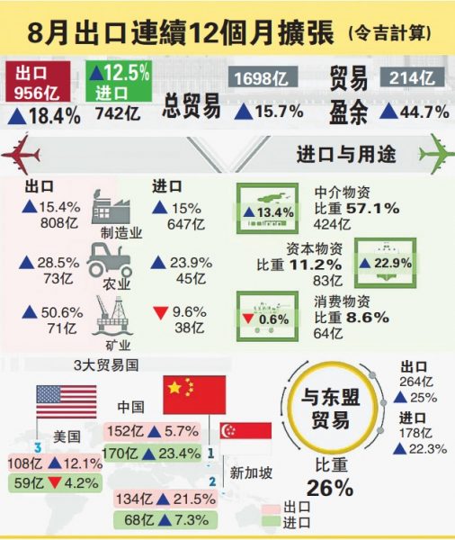 首8个月内,几乎所有出口产品录得增长,制成品增长25.8%至6730亿1000万令吉,主要是电子电器、橡胶产品、石油产品、金属产品与化学产品驱动。