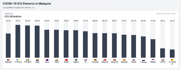 使用率最高的州属是玻璃市,达到90.9%,其他州属和直辖区的ICU使用率皆在90%或以下,包括槟城(87.5%)与登嘉楼(84.2%)。