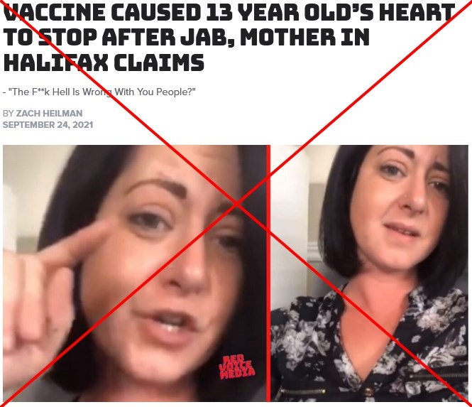 一则标题为《在哈利法克斯的妈妈称,疫苗导致13岁青少年在接种后心脏骤停》的新闻是于本月24日上载到某网站,一名妇女在该视频中说,其女儿刚刚从学校联络她,告知她其中一名朋友接种疫苗后便心脏骤停,目前在哈利法克斯的医院加护病房。