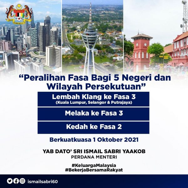 (吉隆坡29日讯)首相拿督斯里依斯迈沙比利宣布,从10月1日起,吉隆坡、雪兰莪、布城及马六甲将进入国家复苏计划第三阶段;吉打则从进入第二阶段。