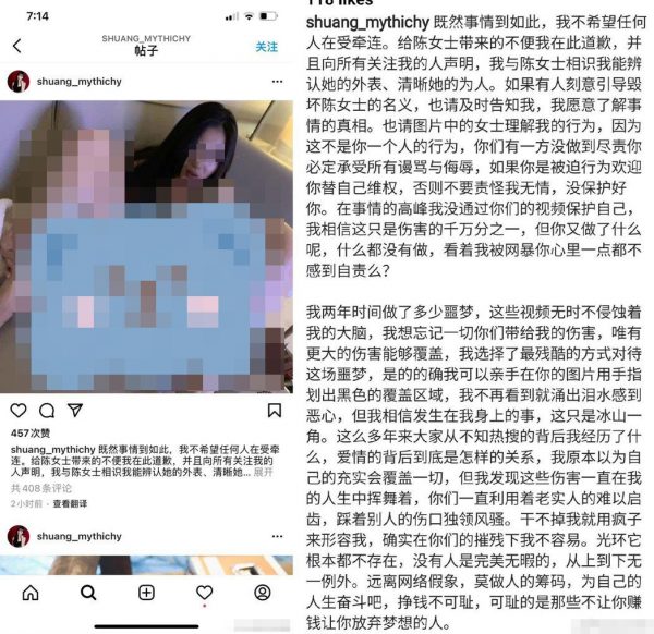 (北京1日讯)中国女星郑爽昨天突然在IG贴出一名女子不雅照,照片经过后制,看不清女子样貌。她还写下“我的图片不糊,不过她们应该不想要那么清晰”,疑似控诉旧爱张恒的劈腿恶行,并等着小三向她道歉。今天她再连PO 4篇帖文,首篇发文更公开小三在床上的不雅照,直接公开对方真面目,同时对照片中的“陈女士”喊话:“请理解我的行为,因为这不是你一个人的行为。”但她稍后已删除这篇帖文。