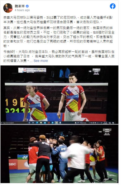 他今日在脸书贴文指出,这也是大马在苏迪曼杯羽球混合团体赛,首次击败印尼队。