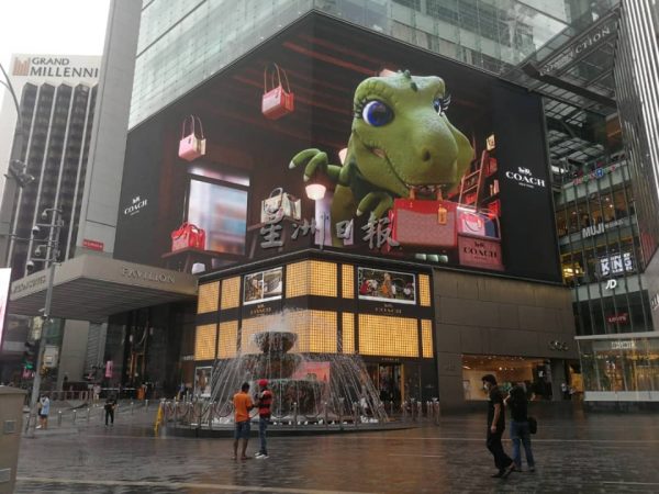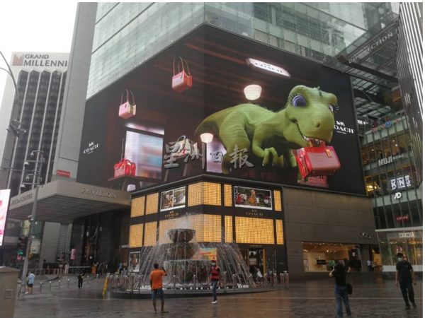 吉隆坡柏威年广场(Pavilion Kuala Lumpur)的蔻驰(Coach)旗舰店上方架设巨大的3D立体广告墙,一头青色大眼的恐龙信步踱进专卖店里,兴奋得左看右看,一口叼来最新款式包包,再弯腰朝人群展示包包款式,高分辨率萤幕完美呈现包包细节,连金属扣子及皮具花纹都活灵活现,简直是一个巨大包包送到眼前,立即勾起购买欲。