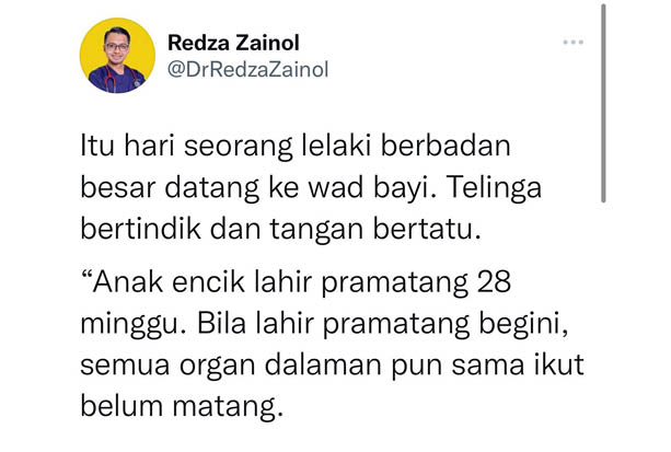 (吉隆坡6日讯)男儿有泪不轻弹,只因未到伤心处。一名文身肌肉型爸爸,眼见剖腹生产后虚弱的妻子,以及仅仅28週的早产儿在氧气箱里插管,为自己无力保护妻儿,在医生面前痛哭流泪。