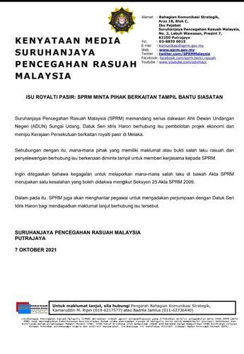 反贪会发表文告要求任何掌握资料及证据者挺身与该会合作。该会提醒,任何知情不报者,有违2009年反贪污委员会法令第25条文。