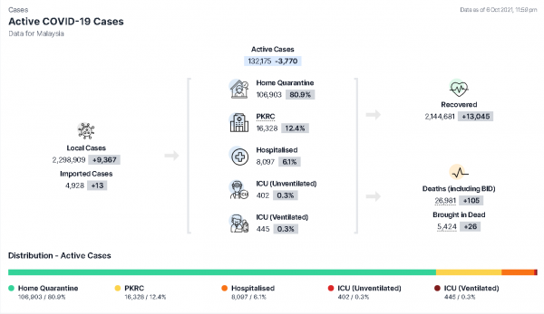 根据卫生部COVIDNOW网站数据显示,在这些活跃病例中,有80.9%确诊患者或10万6903人正居家隔离,12.4%或1万6328人则在低风险冠病治疗及隔离中心(PKRC)。