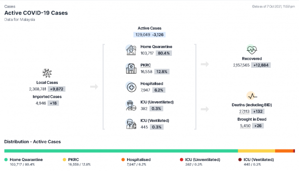数据显示,在这些活跃病例中,有80.4%的确诊者或10万3717人正居家隔离,12.8%或1万6558人在低风险冠病治疗及隔离中心(PKRC)。