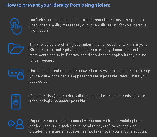 “诈骗者会假装来自一个可靠的组织与人们联系,要求大家提供个人信息或文件,包括银行对账单和信用卡资料、国民登记身分证、护照、驾驶执照或其他身分证明文件的副本,以及线上银行凭证如用户名和密码。”