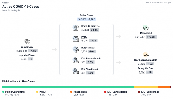 COVIDNOW网站数据显示,这些活跃病例当中,有78.3%确诊患者或8万5383人正居家隔离,14.1%或1万5387人则在低风险冠病治疗及隔离中心(PKRC)。