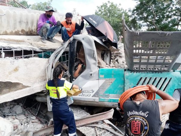(泰国·曼谷14日讯)泰国暖武里府直辖县挽差赐暖武里路12日发生一起工安意外,一座正在拆迁的大楼突然倒塌,20名工人惊慌逃生,但驾驶挖土机的一名工人逃跑不及,被困废墟中,双腿被压无法逃脱,不过他仍意识清醒,警方和报德堂志工立即用切割机器展开抢救,经过约4小时努力,终于把被困工人顺利救出,并送往邻近医院急救。