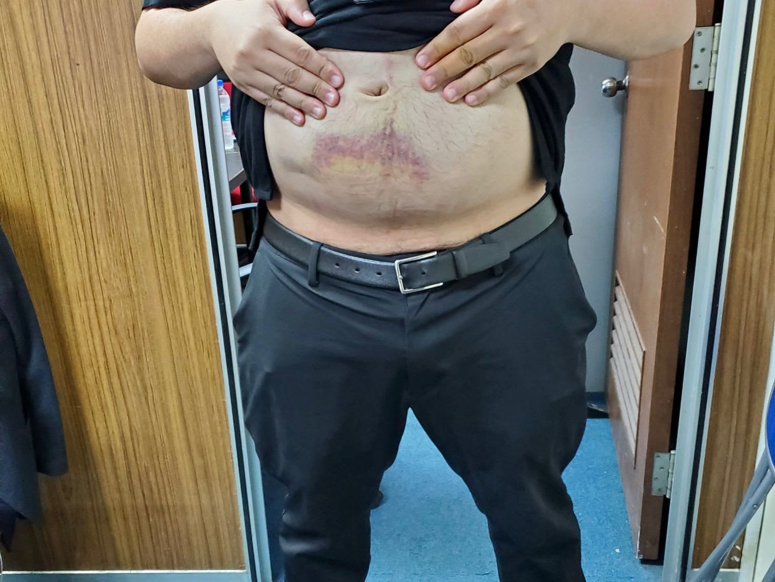 陈凯翔透露,协调员当时受到惊吓发烧,留医大约6个小时,医生给了他3天病假,但之后协调员依然感觉腹部疼痛,又去看了医生,拿了两天病假。事发一个星期后,他肚子上的淤青都还未完全消退,依旧清晰可见。