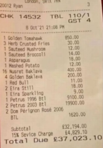 账单显示,该食客点了一份黄金战斧牛排850英镑(约4841令吉)、16块果仁蜜饼400英镑(约2279令吉)、3碟炸薯条30英镑(约171令吉)。