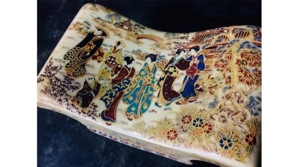 后来我找了一些资料,才知道此物是仿古珐琅彩仕女图瓷枕。沉甸甸的陶瓷质感,冰冷的触觉,难以想像它曾是古代人们的寝具,怎么感觉头枕其上也不会舒适。捧在手心转动仔细观察,发现它中间空心的设计能使空气流动从而降低温度,达到纳凉消暑的助眠效果,才不由自主地赞叹古人的智慧。如今虽已被轻便的软绵枕头取而代之,但这些技法精湛的瓷枕早已变成艺术品。