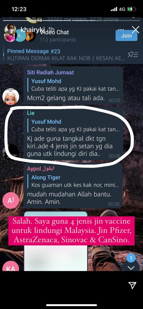 其中一张截图可见,一名反疫苗份子指:“凯里在左手有使用符咒,他使用4种邪灵(Jin Setan)来保护自己。”