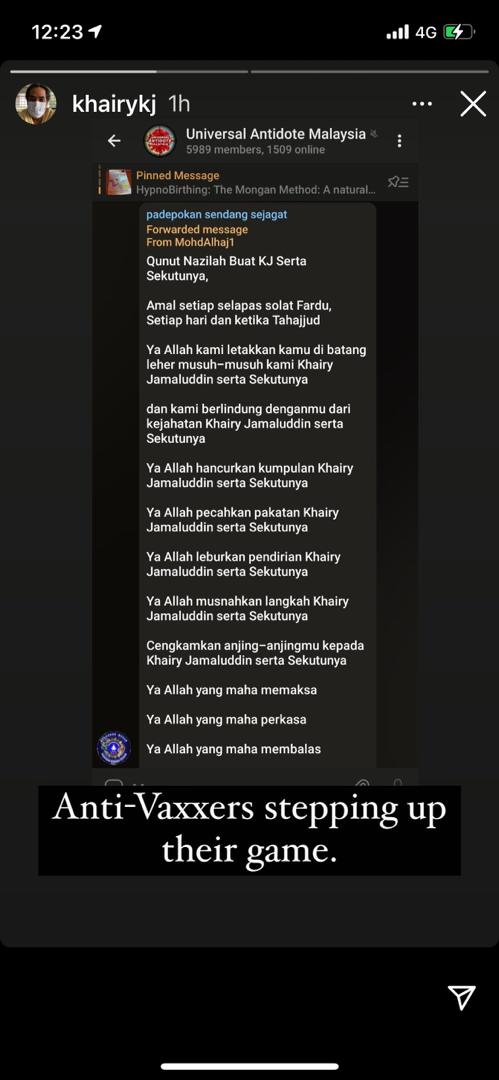 他在Instagram限时动态上载了反疫苗分子在手机应用程式Telegram群组的聊天截图,并反驳他们的指控。
